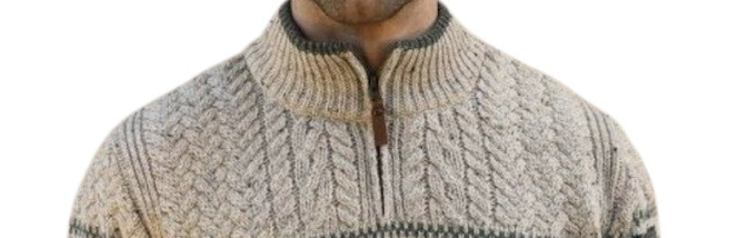 Men’s Sweater Half Zip Jacquard Celtic Oatmeal 100% Donegal Wool Irish Knitwear